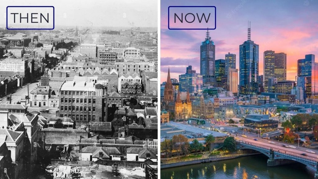 Melbourne changed from a calm early city into a big, busy place full of life. The skyline grew with new towers, the roads expanded, and the city became a center for art, sports, and culture.