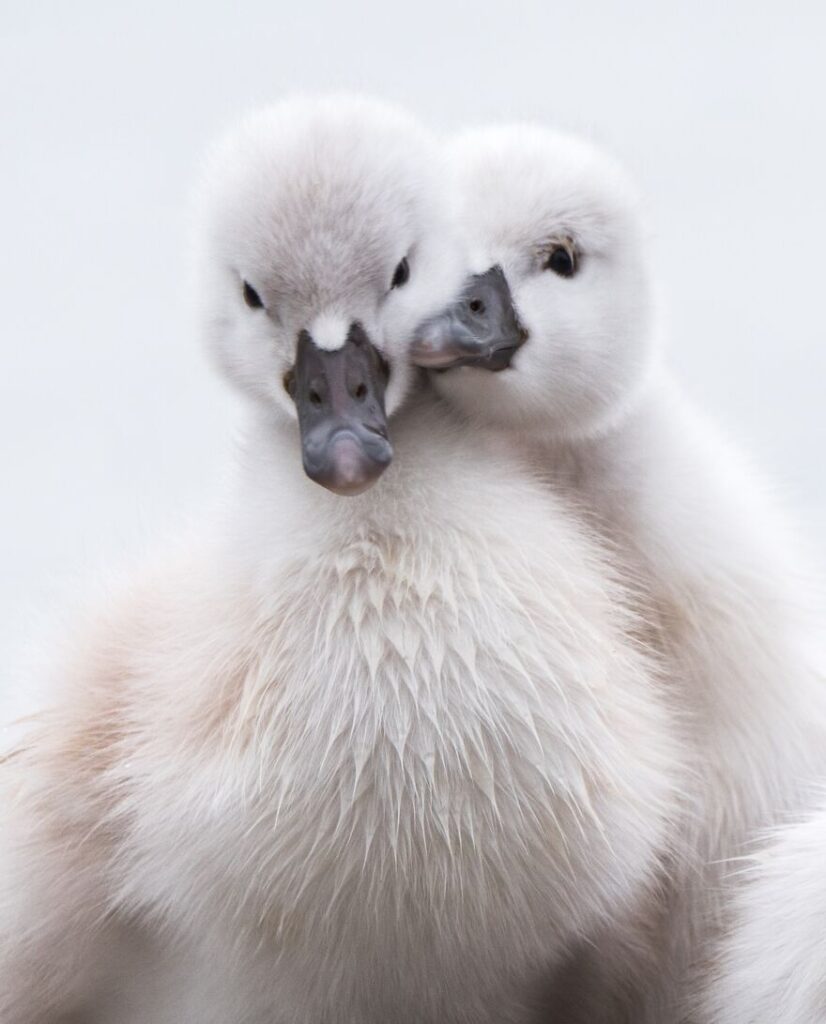 A pair of baby swans waddled up onto the shore and cuddled together along the Lakefront Promenade in Toronto, Canada.