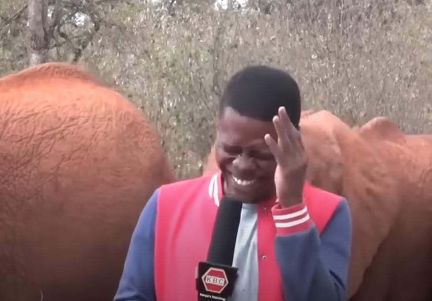 Not feeling threatened at all, the elephant kept tickling Kaunda’s face. The reporter tried his best to stay professional, but soon the situation became too funny to resist.