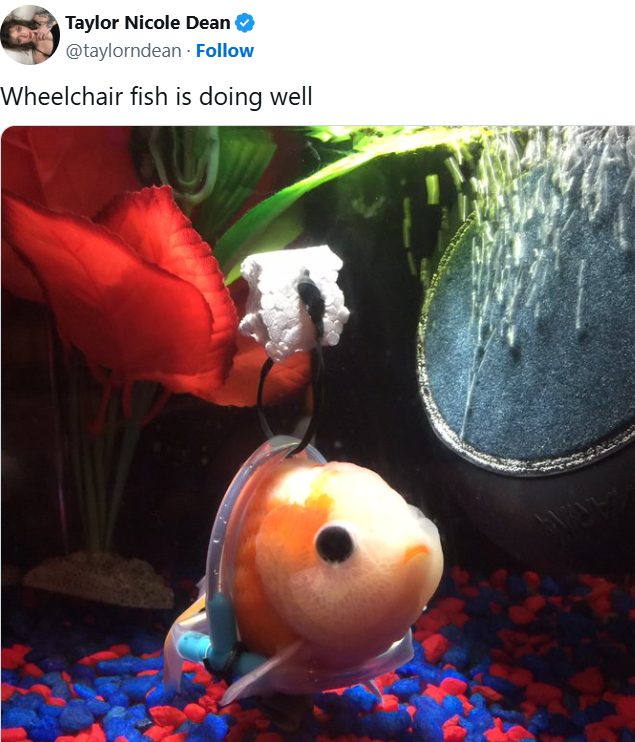 Today, the goldfish spends most of his time in his custom wheelchair, gliding through the water with ease.