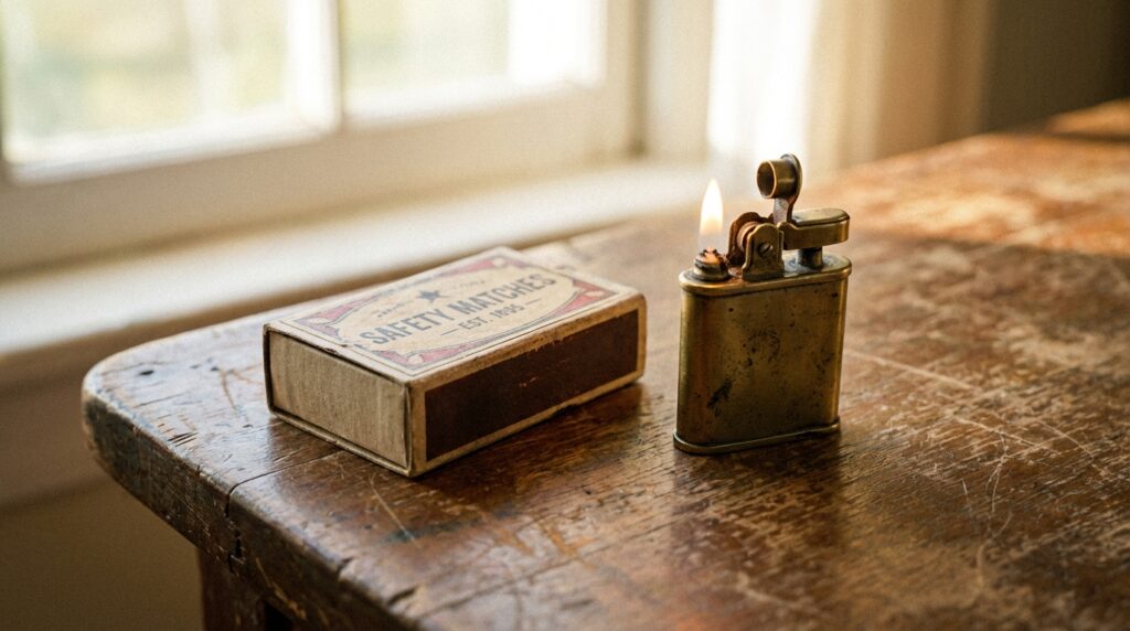 Common sense tells us that a simple wooden match must be way older than a mechanical metal lighter. A match is basically just a twig and a tiny bit of chemical powder. A lighter is a complex machine with sparking wheels and springs and liquid fuel.