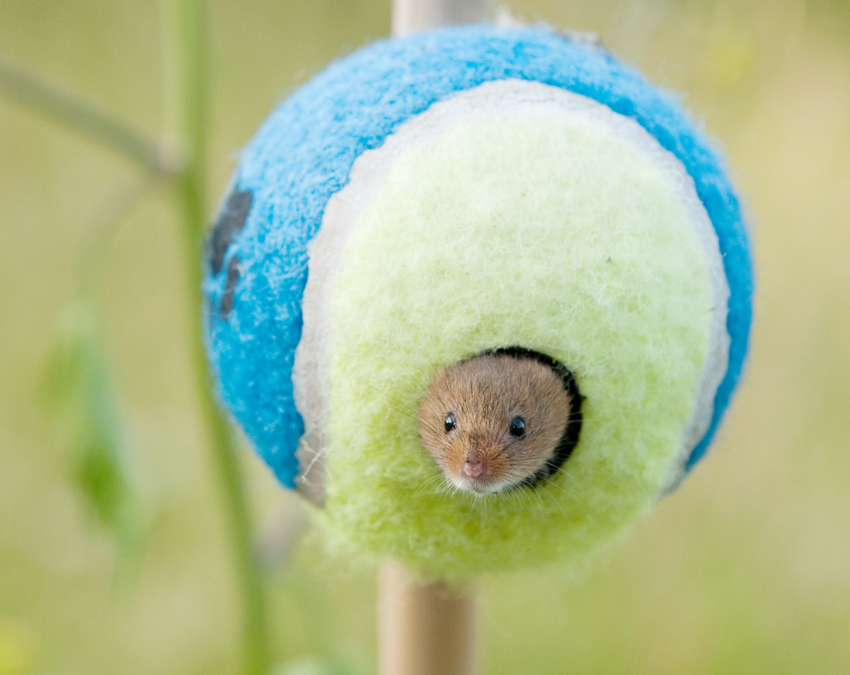 Harvest mice are tiny creatures and are classified as Near Threatened in the United Kingdom. Because they are so small and vulnerable, a hollowed-out tennis ball can make a perfect shelter, protecting them from predators and harsh weather.