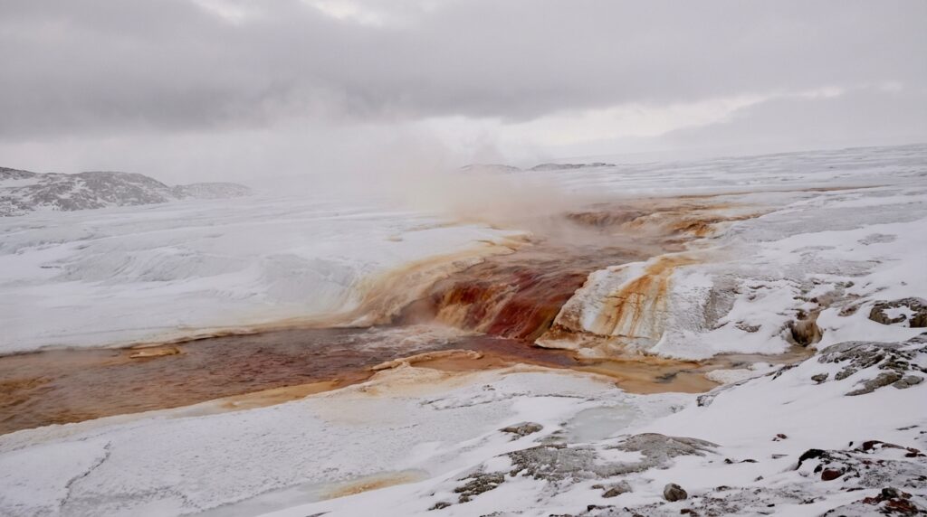 As the trapped subglacial lake gets squeezed by the heavy moving glacier, some of the water is forced out through tiny cracks in the ice. The water is actually perfectly clear while it is still inside the dark glacier. But the exact second this iron rich liquid hits the outside air, it interacts with the oxygen.